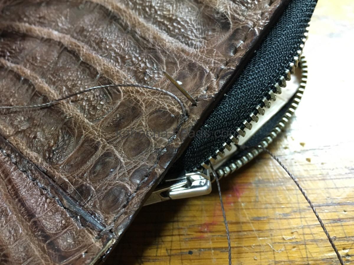 カイマンのあご部分から首にかけての革を使ってるので、その辺の柄が辻褄合わなくならないように極力揃えてパーツ組をしていきます