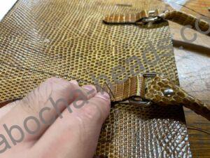前回底鋲を取り付けて、そろそろバッグっぽい形になってきたかな?という感じですが今回はもう何が何だかわからない写真かもしれませんが