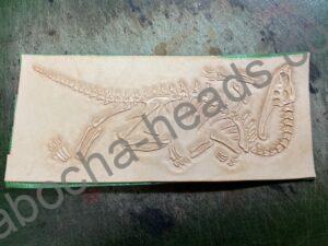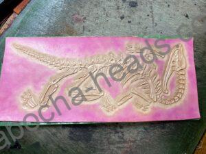 革の性質上濡らして整形すると形が付いたままになるっていうのを利用して、表面にカッティングした溝を刻印で叩いていくとヌメ革に限って(厚みは2mmくらい必要)彫刻に似たようなものが施せます