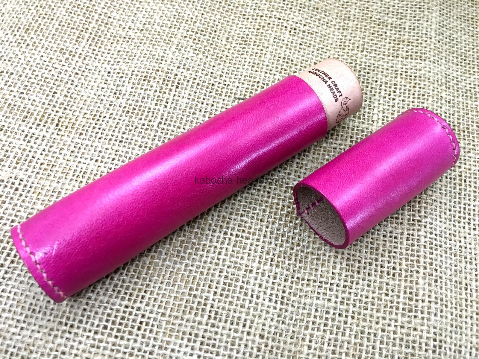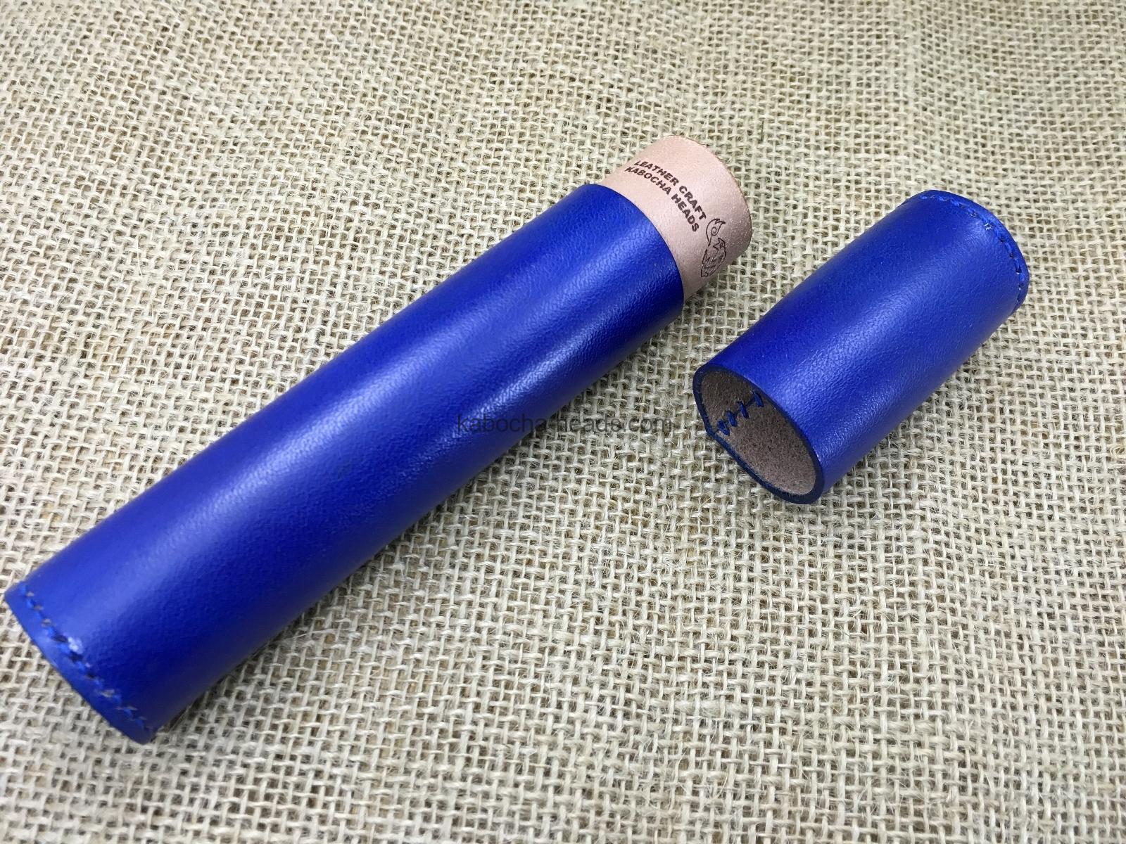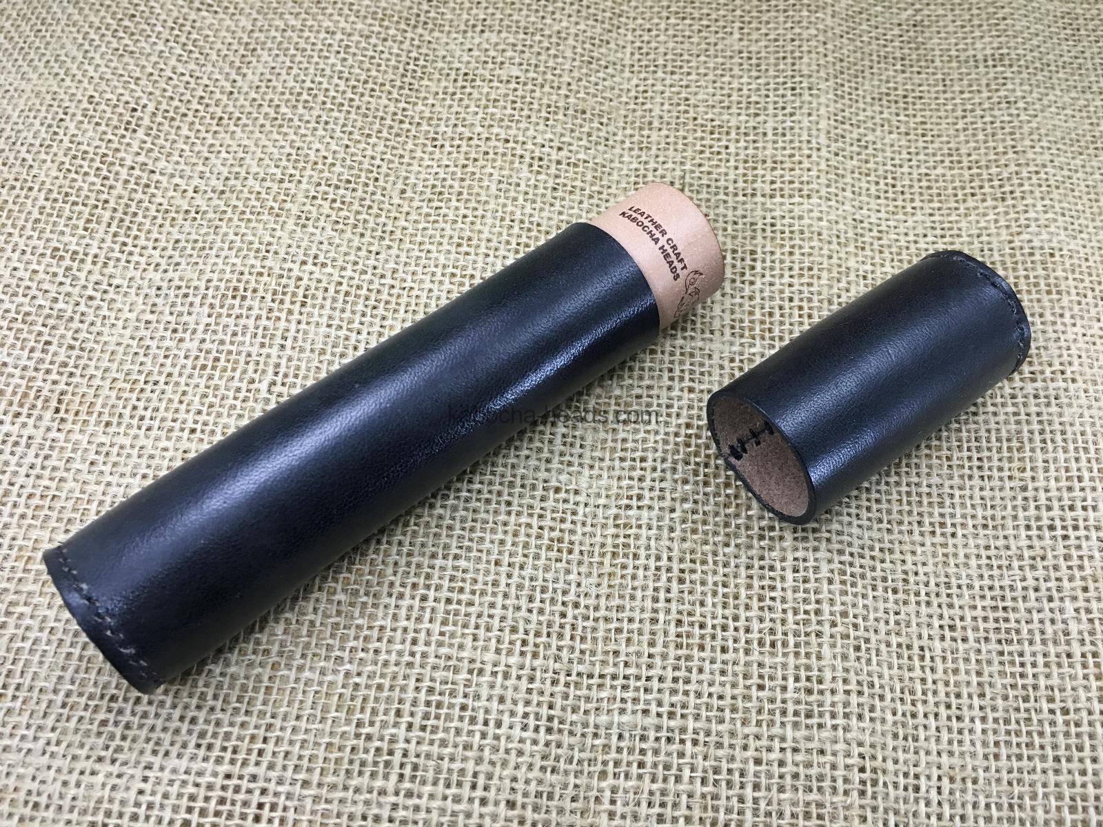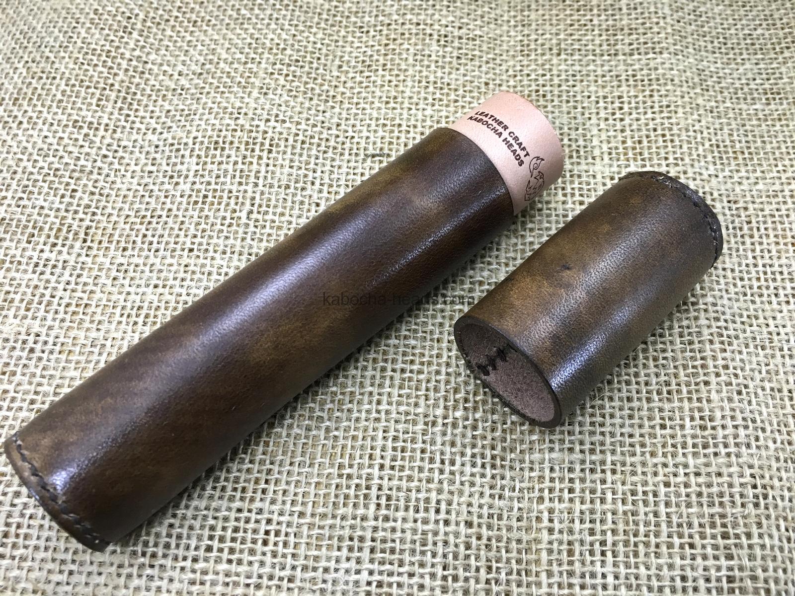 すべて手縫いで作った本革製の円筒形ペンケースです